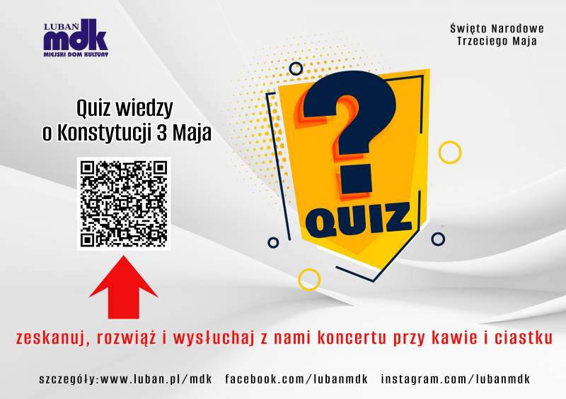 Serdecznie zapraszamy wszystkich mieszkańców - dzieci, młodzież oraz dorosłych - do udziału w quizie poświęconym wiedzy na temat Konstytucji. To doskonała okazja, aby w ciekawy i przystępny sposób sprawdzić swoją wiedzę, przypomnieć sobie najważniejsze informacje oraz dowiedzieć się czegoś nowego.
