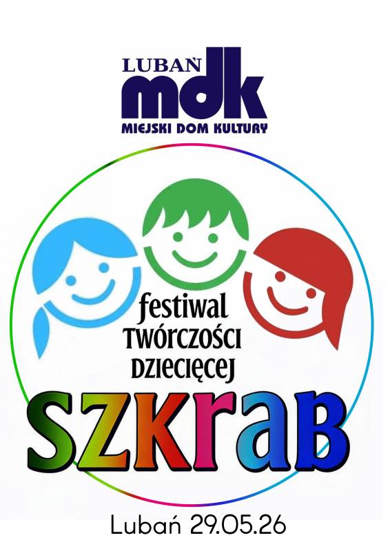 Miejski Dom Kultury w Lubaniu serdecznie zaprasza dzieci z przedszkoli oraz szkół podstawowych (klasy I-VIII) do udziału w Festiwalu Twórczości Dziecięcej SZKRAB 2026, który odbędzie się 29 maja 2026 roku na Rynku w Lubaniu.
